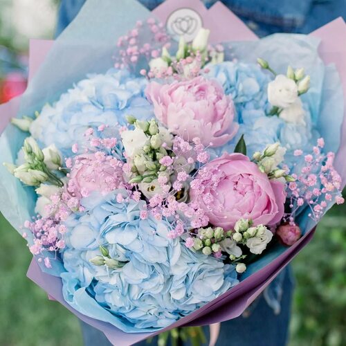 Гортензия макрофилла - это самый распространенный вид гортензий, который имеет крупные цветки с различными оттенками синего, розового и белого цвета. Они прекрасно сочетаются с пионами, создавая букеты сказочной красоты.