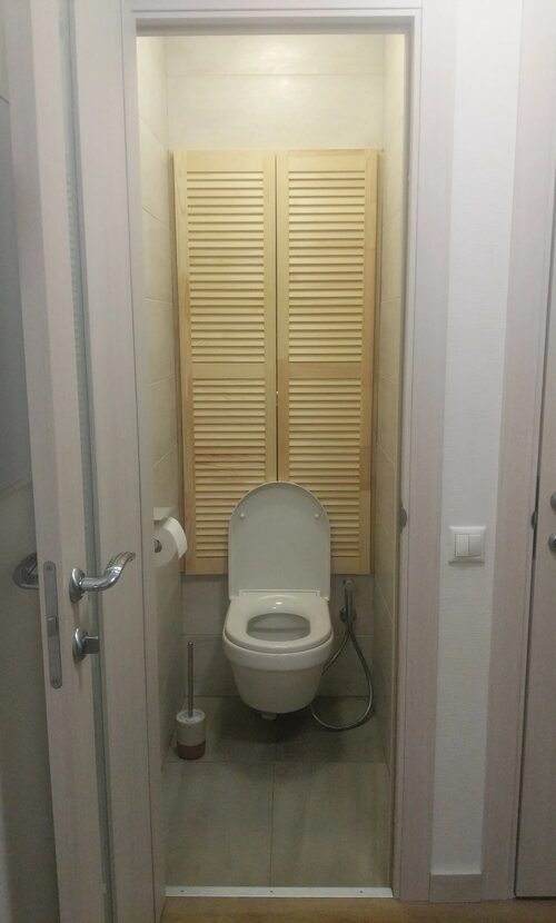 Ниже представлены фотографии различных дизайнерских решений жалюзийных дверей в туалете за унитазом: