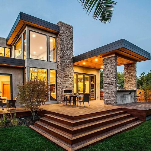 Фасад, облицованный деревом, придает дому теплоту и природную красоту. Древесные панели можно сочетать с другими материалами, такими как камень или стекло, чтобы создать уникальный и элегантный внешний вид.
