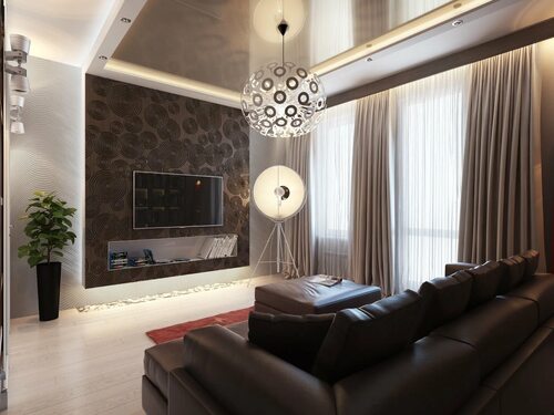 Освещение играет важную роль в создании атмосферы в гостиной. Для подчеркивания дизайна в коричневых тонах, рекомендуется использовать теплое и мягкое освещение. Важно также учесть функциональность помещения и предусмотреть разные источники света - общее освещение, торшеры, настольные лампы. Это поможет создать комфортную атмосферу в разное время суток.
