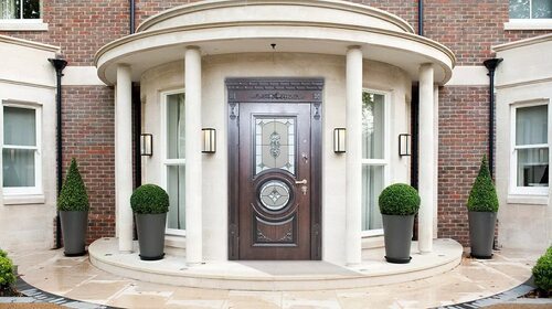 Классический стиль всегда остается актуальным и элегантным. Он характеризуется сдержанными формами, использованием натуральных материалов и изящными деталями. Для парадной входной группы в классическом стиле подойдут колонны, лепнина, ступени с балясинами и элегантные металлические ограждения. Фотография ниже демонстрирует пример такой входной группы.