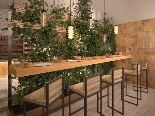 2. Растения: зелень является неотъемлемой частью эко стиля. В кафе можно разместить цветочные горшки, вертикальные сады или даже создать небольшой ботанический сад.