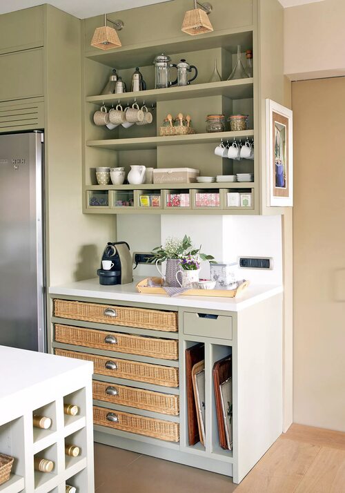 4. Оптимизация пространства: Открытые полки могут быть использованы для оптимизации пространства в вашей кухне. Вы можете разместить на них предметы, которые не влезают в закрытые шкафы или использовать их для хранения предметов, которые вы часто используете.