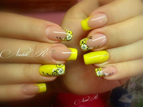 Существует множество вариантов и идей, как можно оформить жёлтый френч на ногтях с рисунком. Вот несколько популярных: