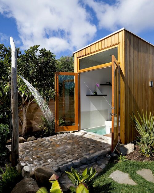 Идеальное место для душа - это терраса или открытая площадка с красивым видом. Также обратите внимание на близость к водопроводу или возможность использования дождевой воды.