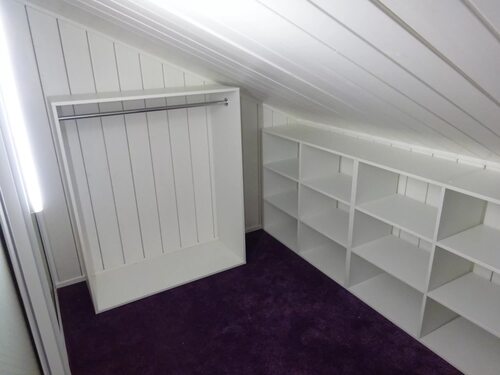 Ниже представлены несколько фотографий гардеробных комнат на мансарде под уклоном, которые помогут вам найти идеи для создания своего уникального пространства.