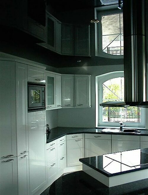 Черный натяжной потолок придает кухне стильный и современный вид. Он может быть использован в различных стилях интерьера, от минимализма до индустриального дизайна.