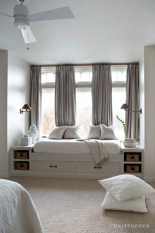 Кровать у окна позволяет максимально использовать естественное освещение. Утренний свет наполняет комнату энергией и создает приятную атмосферу для пробуждения. Кроме того, дневной свет делает комнату более просторной и светлой.