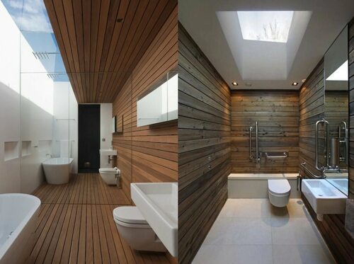 Дерево можно использовать для отделки различных элементов в туалете. Рассмотрим несколько идей: