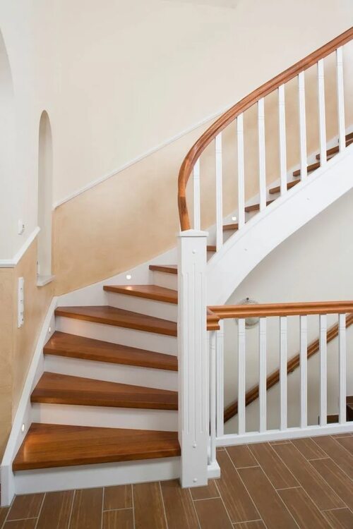 1. Деревянные ступени с белым покрытием и коричневыми перилами. Такое сочетание создаст ощущение естественности и природности, добавив при этом стильности и изыска.