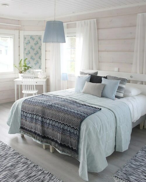 2. Потолок. Если вы хотите добавить особого очарования в спальню, покройте потолок белой вагонкой. Это создаст эффект белого неба и добавит в комнату ощущение свежести.