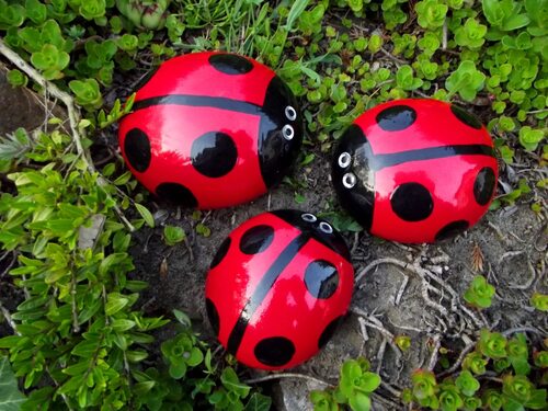 После того, как лак полностью высохнет, вам останется только выбрать место для размещения Божьих коровок в саду. Вы можете создать композицию из нескольких коровок или разместить их по отдельности. Играйте с масштабами и цветами, чтобы достичь наилучшего эффекта.