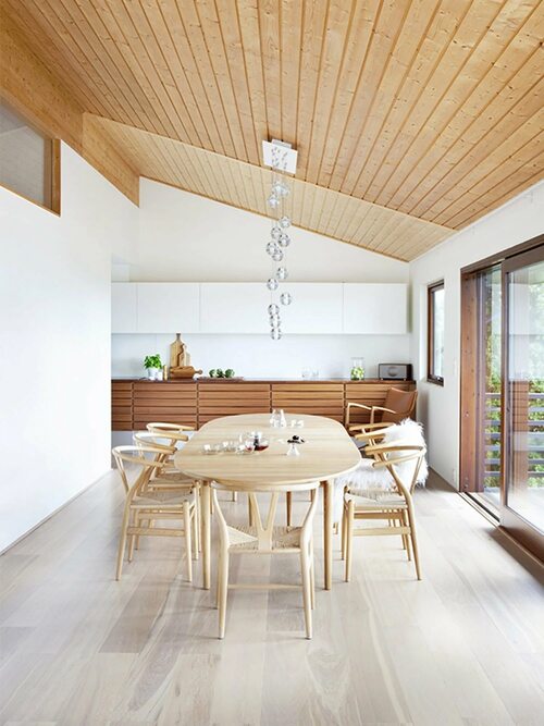 Вертикальный потолок из вагонки, который создает ощущение высоты и пространства в помещении.