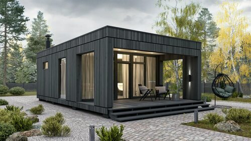 Этот проект модульного дома с плоской крышей предлагает просторную террасу, которая станет идеальным местом для отдыха и проведения времени на свежем воздухе. Большие окна и открытая планировка создают ощущение простора и свободы. Крыша с плоским профилем позволяет установить садовые грядки или даже создать зеленую крышу, что сделает дом еще более экологически чистым.
