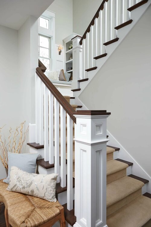 В скандинавском стиле лестница с белыми перилами и светлыми коричневыми ступенями создает атмосферу уюта и комфорта. Простые формы и натуральные материалы отлично сочетаются с другими элементами интерьера в скандинавском стиле.