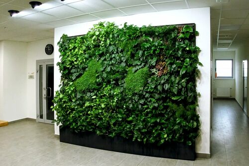 - Улучшение микроклимата: растения на фитостене фильтруют воздух, поглощают шум, повышают влажность и создают комфортную атмосферу.