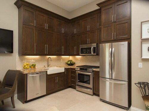 Если вы предпочитаете современный стиль, то можно создать дизайн кухни в коричневых тонах в стиле модерн. Здесь акцент делается на гладких поверхностях, минималистичных формах и современных материалах. Коричневые фасады кухонных шкафов, стеклянные поверхности и металлические акценты создадут стильный и современный интерьер.