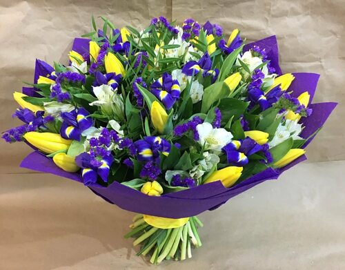 Вот и готов ваш яркий и стильный букет из желтых тюльпанов и ирисов!