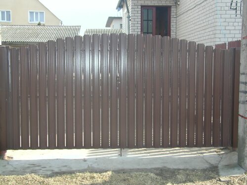 1. Конструкция: Распашные ворота состоят из нескольких секций металлоштакетника, которые крепятся на вертикальные столбы. Они могут быть выполнены в различных вариантах открытия, например, наружу или внутрь.