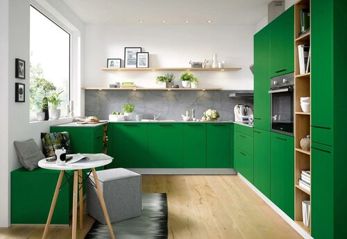 Если вы предпочитаете современный стиль, то можете выбрать насыщенный серо-зеленый оттенок для фасадов кухонной мебели. Добавьте глянцевую отделку и минималистические аксессуары для создания стильного и современного интерьера.