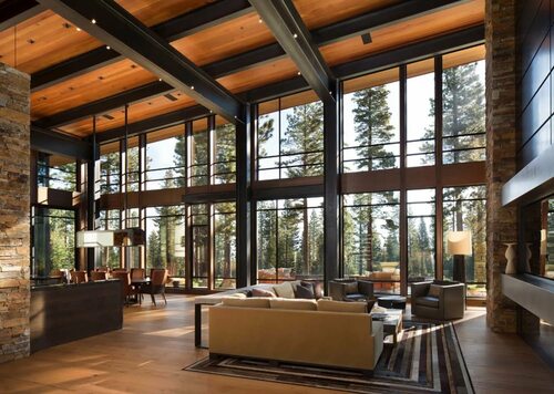 - Естественное освещение. Панорамные окна позволяют максимально заполнить помещение светом, создавая яркую и приятную атмосферу внутри дома.