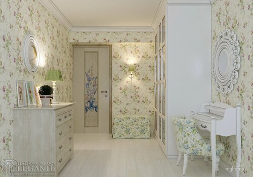 Цветочные мотивы - это одна из характерных черт стиля прованс. Использование обоев с цветочным принтом в прихожей добавит романтичности и жизнерадостности. Особенно хорошо такие обои будут смотреться на фоне белых мебельных элементов. Фото 2.