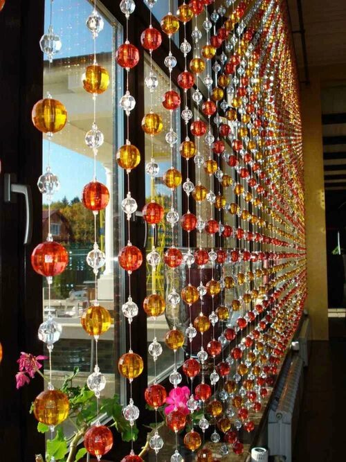 Бусины, из которых выполнены шторы, прекрасно переливаются на солнце, создавая игру света и тени в помещении. Это придает особый шарм и атмосферу комнате.