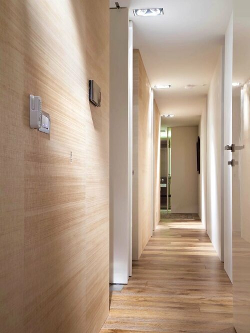2. Вертикальные полосы. Используйте ламинат для создания вертикальных полос на стенах прихожей. Этот прием визуально удлинит помещение и добавит ему динамику.