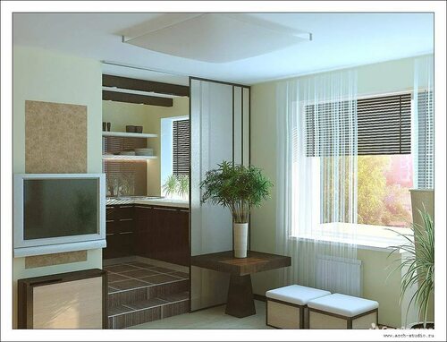 Стены можно окрасить в одинаковый цвет или использовать разные оттенки для зон кухни и комнаты. Также можно использовать обои или декоративные панели для создания интересных акцентов.