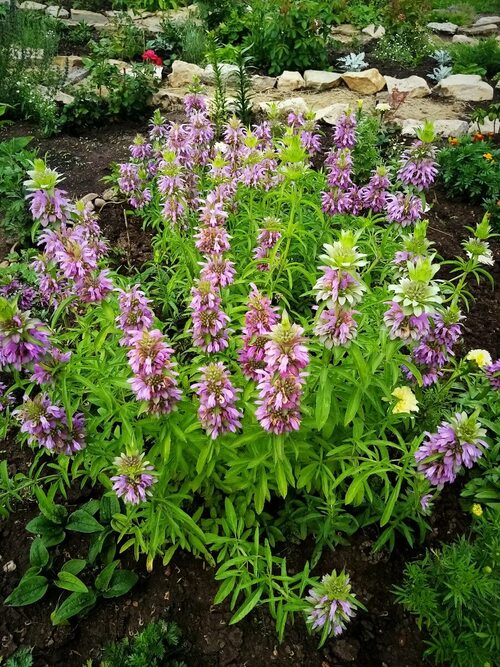 Монарда пунктула, или пятнистая монарда, отличается своими желтыми соцветиями с пурпурными пятнами. Этот вид монарды привлекает не только пчел, но и маскировочных насекомых, которые питаются его нектаром.