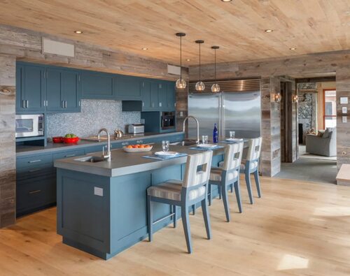 2. Кухня с серым островом. Остров в сером цвете станет ярким акцентом в деревянной кухне. Вы можете выбрать контрастный оттенок серого или использовать одинаковые цвета для всех элементов кухни.