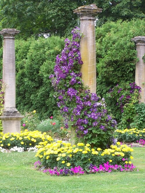 Клематис можно использовать для создания различных композиций в саду. Он может стать центральным элементом в вертикальных композициях, висеть с крышей беседки или скрывать непривлекательные участки сада. Кроме того, клематис можно сочетать с другими цветами и растениями, создавая яркие и красочные композиции.