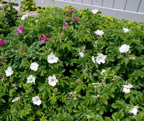 Роза ругоза Альба прекрасно сочетается с различными растениями, создавая эффектные композиции. Рассмотрим несколько вариантов сочетания: