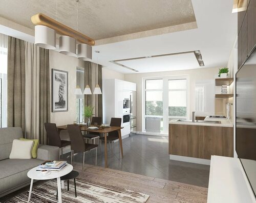 2. Разделение зон: используйте мебель или перегородки, чтобы визуально отделить кухню от гостиной, но при этом сохранить ощущение открытости и простора. Например, вы можете использовать стойку-бар или полки, чтобы создать разделение между зонами.
