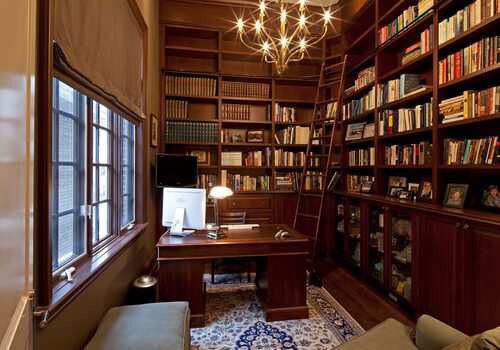 Освещение играет важную роль в кабинете библиотеке. Предпочтительно использовать натуральное освещение, поэтому расположите стол и места для чтения возле окон. Если это невозможно, обеспечьте комнату достаточным количеством и правильным типом искусственного освещения.