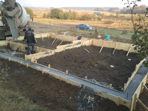 Приведенные ниже фотографии позволят вам увидеть этап залития фундамента под дом и представить себе, как выглядит процесс строительства основы для вашего жилища.