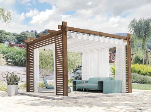 Пергола с навесом из ткани может быть выполнена в различных стилях и вариантах дизайна. Вот несколько популярных вариантов:
