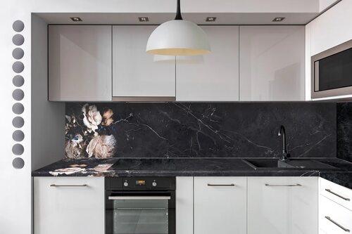 Черная столешница и фартук обладают практичностью в уходе. Они менее подвержены пятнам и царапинам, что облегчает их чистку и поддержание идеального вида на протяжении долгого времени.