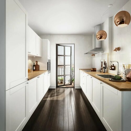 Если у вас есть возможность расширить пространство кухни вдоль стены, то галерейная планировка может быть отличным вариантом для длинной узкой кухни. При таком подходе рабочая зона и холодильник располагаются на одной стороне, а раковина и плита на другой. Это позволяет создать эффективный и удобный поток работы, освобождая центральную часть кухни для других функций или пространственных решений.
