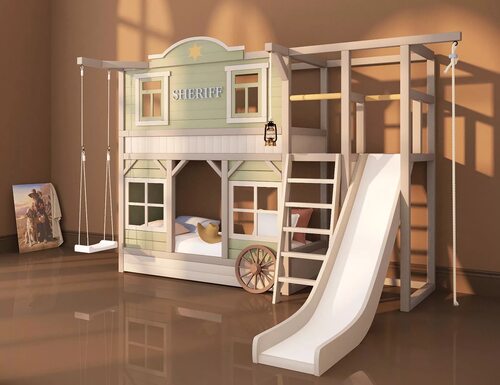 Одним из популярных вариантов является кровать с верхним спальным местом в виде домика и горкой. Это отличное решение для активных детей, которые любят играть и придумывать различные приключения. Домик можно оформить в виде замка, форта или просто уютного домика, где ваш ребенок будет спать и играть.