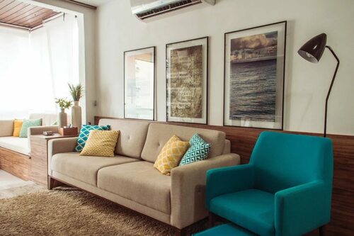 1. Коричневый диван с бирюзовыми подушками в гостиной