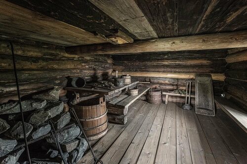 Фото 1: Историческая старая русская баня с деревянными стенами и печью