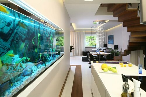 Если у вас достаточно места и вы хотите создать впечатляющий акцент в вашем интерьере, выберите большой аквариум. Он может занимать всю стену или быть центральным элементом в комнате.