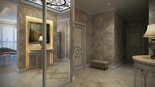 Венецианская штукатурка в сочетании с элементами резьбы по дереву и старинной мебелью создает атмосферу классического стиля в прихожей. Нежные оттенки и гладкая поверхность штукатурки придают интерьеру изысканность и шарм.