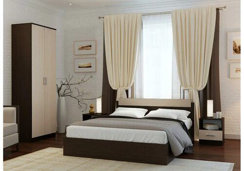 Такая комбинированная мебель идеально подходит для небольших спален. Встроенный шкаф и тумбы обеспечивают удобное хранение вещей, а кровать становится центральным элементом интерьера.