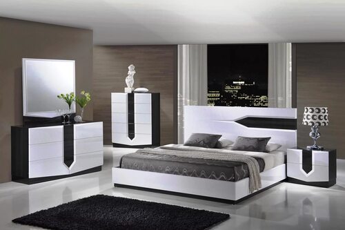 - Черный гарнитур с матовыми фасадами и скрытыми ручками. Такой дизайн придает спальне строгий и сдержанный вид, идеально подходящий для любителей современного стиля.