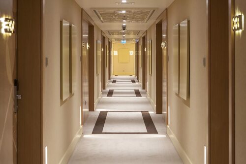 Стены и пол в коридоре могут быть оформлены различными способами, чтобы создать интересный и стильный образ. Рекомендуется использовать качественные обои или покраску, которые будут сочетаться с общим стилем интерьера отеля.