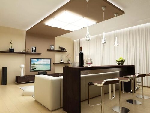 Установка барной стойки за диваном имеет несколько преимуществ: