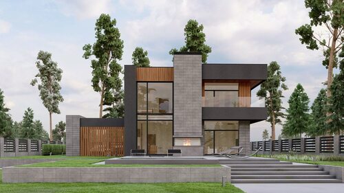 Этот проект представляет собой дом в стиле минимализма с монолитной крышей. Фасад дома выполнен из стекла и бетона, что создает чувство легкости и простора. Большие панорамные окна позволяют наслаждаться красивыми видами на природу.