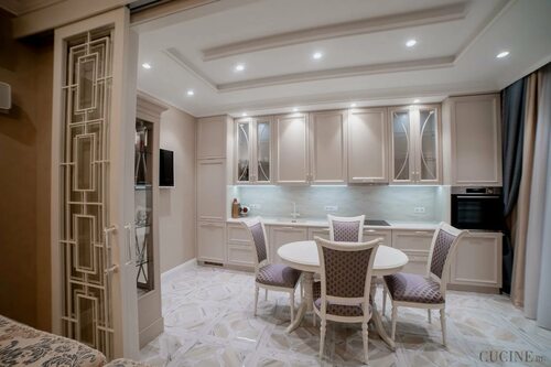 4. Добавьте детали и акценты: хрустальные люстры, карнизные элементы, фигурные фасады - все это придаст интерьеру кухни неоклассического шарма и роскоши.